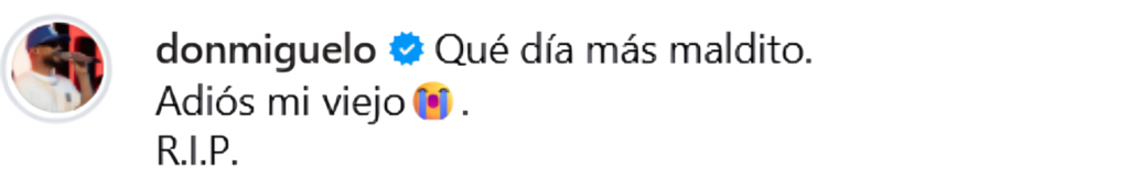 Con pocas palabras, pero con una carga emocional evidente, el cantante dejó ver el difícil instante que vive junto a los suyos. “Qué día tan difícil. Adiós, mi viejo. R.I.P.”, escribió Don Miguelo en una publicación que rápidamente captó la atención de miles de seguidores, colegas y figuras del entretenimiento nacional, quienes no tardaron en expresarle mensajes de apoyo, fortaleza y solidaridad.